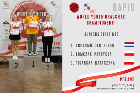 Fleur Kruysmulder veroverde tweemaal goud op het WK dammen voor jeugd in Polen. Ze werd deze maand jeugdwereldkampioen in de disciplines blitz en rapid. Het jonge talent van Damvereniging VBI bleef het hele toernooi in alle disciplines (in totaal 27 partijen!) ongeslagen.